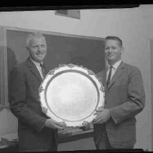 Two men hold the silver plate signifying sales achievement. The man on the left is Bob Frakes and on the right is the salesman Lloyd Troyer.