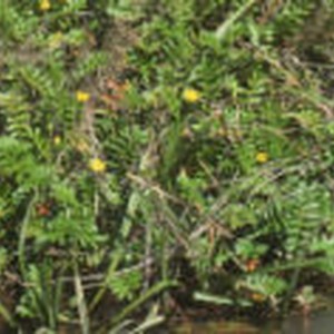 Close-up of the grandis variation greenery and yellow flowers growing along the water's edge at Hazard Creek.