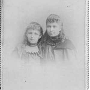 Photo--black and white, cabinet card: Photo of Nora and Edna Elfman, family relatives or friends of the Sebring / Allen family. Photo by Blanchard, Aleria de la Plaza, 513 N. Main Street, Los Angeles, CA. Circa 1875s
