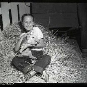 State Fair 1950 - Girl holding piglet while sitting on haystack in corner of pen.