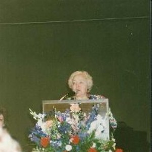 Frances Burt speaks from a podium. On the back of the print is written in ink, "Kansas City." This photo correlates with 2003/051/198 and places it in Kansas City for installation of National Officers. Photograph removed from file folder, National Organization of the NLAPW, 2003/051/027.