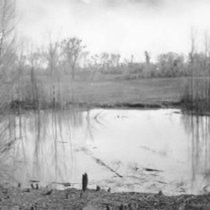 View of a pond or section of the river near the bridge construction.
