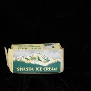 Yellow ice cream box with yellow and green scenery of Mt. Shasta. "Shasta Ice Cream." Manufactured by Shasta Ice Cream Co.
