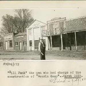 View of partially completed "Roaring Camp" in Southside Park. Shown is Bill Funk who was in charge of construction.