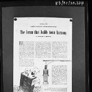 SERIES View of article titled "The forum that builds town harmony." The report shows a microphone, bible and three photos.