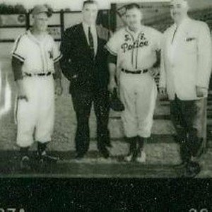 SERIES. View of Sacramento Police Chief Jim Hicks standing with Mayor George Christopher of San Francisco and two unidentified baseball players. One baseball uniform says, "S.F. Police."