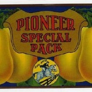 Lug label. Pioneer Special Pack California Pears, Packed by Lambert Marketing Co., Main Office Sacramento, Calif. Cluster of pears. "Leaps Ahead" logo of woman jumping a horse over fence.