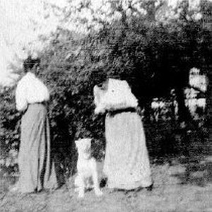 Photo of Mrs. Laws, Lucy [Jane Ray] Hundley and dog, Sandy, in an outdoor location.