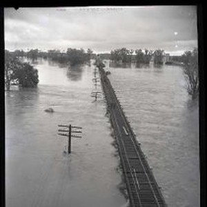 General Aerials of American River flood Western Pacific trestle at 16th St. underpass. November 19, 1950 - 15 of 16