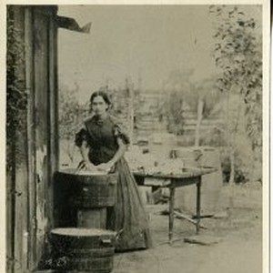 Exterior view of a Mary A. Cunningham Fisher standing at an outdoor laundry tub.