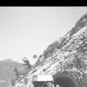 Family posing in front of auto parked in front of a road tunnel