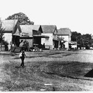 Photo--black and white: North Main Sebastopol in 1888. L to R: Groff's Grocery, Morris and Son Meat Market, Unknown, T.G. Wilton Store, I.O.O.F Hall and Wells Fargo.