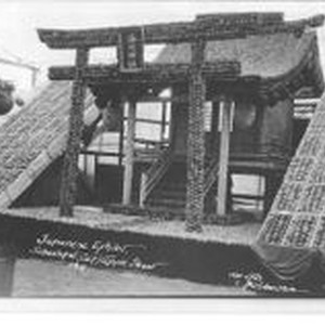 Postcard photo, black and white: A 1911 Gravenstein Apple Show Japanese exhibit with a temple made of apples and boxes of apples on either side. Photo taken by M. D. Silberstein.
