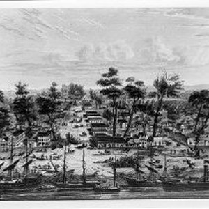 Copy Print: Bird's Eye view of Sacramento City, California from the foot of J Street. Drawn by George V. Cooper in 1849. This view shows elements of the original