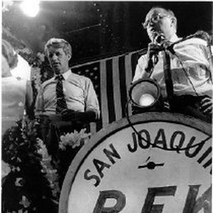 "Congressman Robert Leggett introduces Robert F. Kennedy" from the back of a rail car at the Southern Pacific Railroad Depot in downtown Sacramento. Large RFK campaign sign in foreground.
