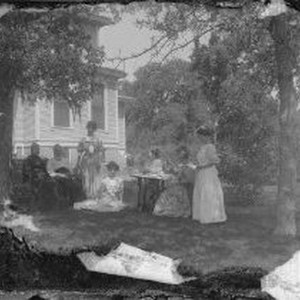 Exterior view of seven women seated in the front yard of possibly the Hodge House in Fair Oaks.