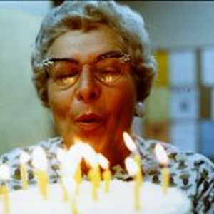 Image / Unidentified older woman blowing out candles on a birthday cake