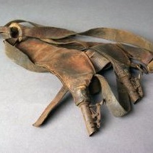 A pair of leather shot flasks attached by a leather chest harness. The flasks are long narrow leather bags with brass dispensing devices.