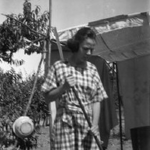 Alma Senia Nassi sweeping camp at Crocker Ranch in Loomis, California. From the notes written by Alma Senia Nassi Larsen attached to the negatives: "Packing at Crocker Ranch We camped at the Crocker Ranch 1921 after 3 years working for Rudolph Nixon and Frae Denton. Nixon would come get us each morning and bring us back home at night or after work. We rode in his Hudson Super Six - Nixon used to tell us his brother willed him $200 a month as long as he lived. We had a lot of experiences at Nixon ranch learning how to pack, etc. But we thought the Crocker Ranch would be more super. Close to the American River. We had our tent to sleep in, an awning put up for our kitchen and we had brought all the stuff from home. Every nite we'd take off to the RIver for a swim. At that time they were hydraulicking up in the hills and the river was red water. I almost drowned the 1st time we went down there. Jenny was going to teach me to swim and we got in a deep hole and I went down and grabbed Jenny and we both almost got it; as I got up I held my hand out Maiela caught it and pulled me out. I owe my life to her. It was a close call. Jenny, Aili, Mait, Rachel, Ino, Kitra, me workd for Crocker. Wallen's also were camped there - and there were the Carters (Rose his wife) - he later was Loomis Constable - and Carter's brother and family, 2 girls and a boy and Helen. I drew Ritchie's picture and its in my scrapbook. He threw a soft peach at it. Also we sent another one to the Earl - never heard how he liket it - but old Mrs. Crocker did. She was a Mormon. Her sister lived next door and across the street from Mas in Rocklin."