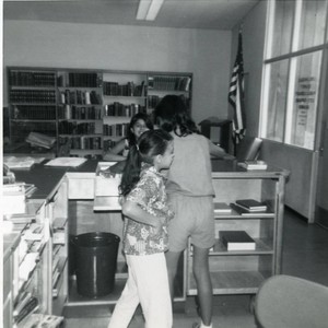 Three youth are busy helping at the circulation desk of City Terrace Library, Summer 1966.