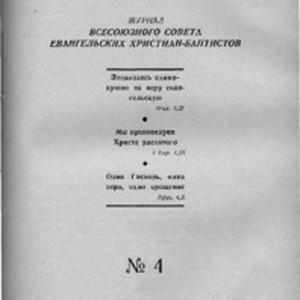 In 1945, The United Union of Evangelical Christians (EC) and Evangelical Christian Baptists (ECB) published the first issue of the Brotherly Herland. Iakov Ivanovich Zhydkov, chairman of the national (USSR) Union of Evangelical Christians and Baptists, became the chief editor. The editorial committee consisted of M.I. Golyaev, M.A. Orlov, and Alexander Vasi'yevich Karev. The leadership of the NUECB (all-National Union of Evangelical Christian Baptists) set the main task of the journal to form "Unity" in the midst of protestant churches of the moderate type. Thus, in the preface of the first issue of the journal it was stated, "The task of the Brotherly Herald is to work in such a way that unity might penetrate the bodies and blood of all brothers and sisters and become indestructible even going through tests and difficulties. May the Lord Himself make one united nation of two movements in His Name. Our mottos are the words from the Holy Scripture, they are dear to our hearts, 'We preach Christ crucified' (1 Cor. 1:23), 'Stand firm in one spirit, contending as one man for the faith of the gospel' (Phil. 1:27), 'One Lord, one faith, one baptism' (Eph. 4:5)". ❧ The second purpose of the periodical (which was to be published every other month) was to inculcate "correct training" of church members (correct from the spiritual as well as civic points of view). This purpose was successfully fulfilled by publication of texts of sermons, spiritually-edifying articles, official appeals and reports. The journal consisted of the following contents: 1. Religious and patriotic Evangelical Christians and Baptists and the Motherland. 2. Sermons and spiritual articles. 3. From history of the Evangelical Baptist movement in USSR. 4. From history of Christianity. 5. Biographies and necrologies of Evangelical Christians and Baptists. 6. Life and activity of NUECB. ❧ The address of the editorial office was in Moscow, Pokrovsky Boulevard, Maliy Vuzovsky Lane, 3. [Description English/roman)] В 1945 году объединенный союз ЕХ и ЕХБ издал первый номер периодического издания «Братский Вестник», главным редактором стал председатель Всесоюзного Совета евангельских христиан и баптистов Я.Жидков. В редакционную комиссию вошли Голяев М.И., Орлов М.А., Карев А.В. Основной задачей журнала руководство ВСЕХБ видело в формировании «Единства» среди протестантских церквей умеренного типа. Так в предисловии к первому номеру журнала писалось: Задача «Братского вестника» - так повести свою работу, чтобы дело единения вошло, в плоть и кровь всех братьев и сестер, чтобы оно стало нерушимым даже при испытаниях и трудностях, и чтобы теперь уже Сам Господь соделал из двух течений один народ во имя Свое. Нашими лозунгами являются дорогие всем нам слова Св. Писания: ‹Мы проповедуем Христа распятого› (1 Кор. 1, 23) ‹Стойте в одном духе, подвизаясь единодушно за веру евангельскую› (Фил. I, 27) ‹Один Господь, одна вера, одно крещение› (Ефес. 4, 5)». ❧ Вторая цель этого периодического издания которое планировалось издавать один раз в два месяца было прививать «правильное воспитание» членов церкви «как с духовной, так и с гражданской точки зрения» . Данная задача достаточно успешно выполнялась посредством публикации проповедей, духовно-назидательных статей, официальных обращений и отчётов. Журнал состоял из следующих рубрик: 1. Религиозно-патриотический Евангельские Христиане и Баптисты и родина. 2. Проповеди и духовные статьи. 3. Из истории Евангельско-Баптистского движения в СССР. 4. Из истории Христианства. 5. Биографии и некрологи Евангельских Христиан и Баптистов. 6. Жизнь и деятельность ВСЕХИБ. 7. Жизнь общин на местах. 8. Корреспонденция. ❧ Адрес редакции находился в г. Москве, Покровский бульвар, Малый Вузовский пер., дом. 3." [Description (original non-English/roman language/script)]