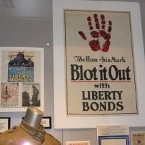 A composite of three Liberty Bond promotional posters a. Beat back the Hun with Liberty Bonds multi-colored with a cartoon graphic of a menacing male figure. b. That Liberty Sahll Not Perish From The Earth Buy Liberty Bonds with a bi-colored graphic of the Statue of Liberty. c. Hun Or Home ?Buy Liberty Bonds with a monochrome graphic of a young woman holding a child being menanced by a male figure At the bottom of the sheet is text Here's What You Fight - Every Bond---------