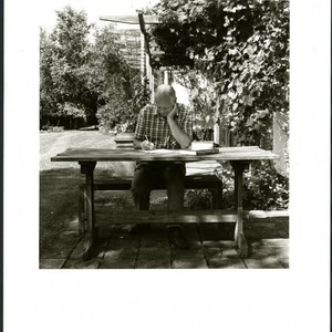 Grayscale photo of Charles Handy taken by Elizabeth Handy. Handy is pictured seated at a table outside, writing on a notepad, with his forearm vertical on the table and head resting in his left hand. To his left, two books are immediately visible.