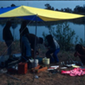 A biology class working under a canopy by shore of pHake Lake.