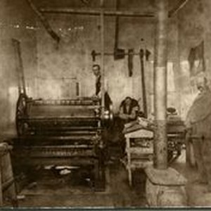 Mrs. McDonell (Ivy), Alanson Folger, Jr., Frank Kimball, Charley Gallagher and J. P. McDonell inside J. P. McDonell's printing press in 1904 Sebastopol, California, 1904