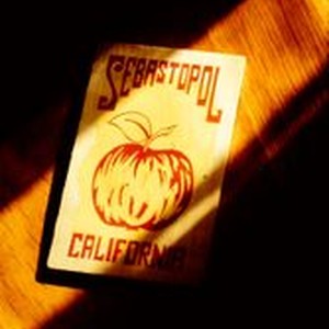 Slide, color, Ektachrome Transparency; Sign or label with Gravenstein apple in center, with caption "Sebastopol California." Slide dated September, 1970.