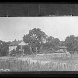 View of street scene showing 2nd and F Streets in Washington, Yolo County. Residents from left to right are: Rinersman, Shaw and Russell homes about 1914-1915.
