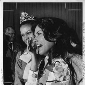 Vanessa Gorre, a sophomore at Sacramento City College, being named Camellia Queen for 1976 at the opening event of the 22nd Camellia Festival at the Quality Inn-Woodlake. Pamela Kay, last year's queen, is in the background.