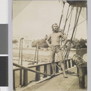 Ernest Darling stands on wooden deck of ship near shoreline. Title and date transcribed from envelope. Ernest Darling inspired Jack London's story "The Nature Man." Photo is affixed to cardboard. Ship is possibly the Snark of London's Voyage of the Snark.