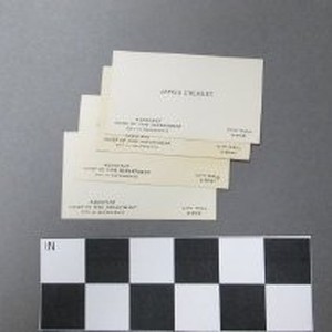 Four business cards. Black print on white paper, "James Calvert, Assistant Fire Chief of Sacramento, City Hall 2-5041"