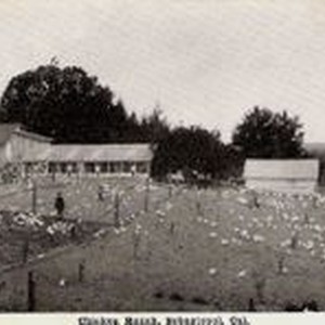 Postcard--black and white--photo- chicken ranch in Sebastopol. Three men and one woman working and feeding chickens. Windmill on left. Chicken coop in background left.