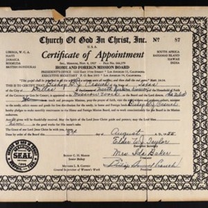 Church of God in Christ Home and Foreign Mission Board certificate of appointment regarding B.J. Crouch, Dallas, Texas, 1955 August 3. [Description English/roman)]