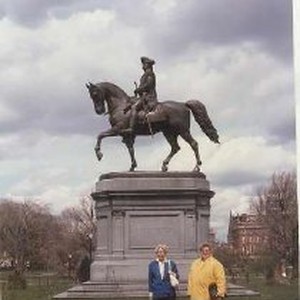 Two women pose in front of a monument holding a man on horseback. They are identified as Florence Wylie and Vicki Lavorini. Photograph is glued onto a piece of paper. Written next to it: "Boston 1986. Florence Wylie. Vicki Lavorini." Photograph removed from file folder, National Organization of the NLAPW, 2003/051/027.