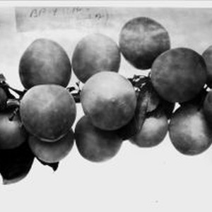 Photo--black and white: Plums on a branch. Caption and handwritten on back: "Plum BB-9 (E branch and W. limb of No. br. Photographed July 1929."
