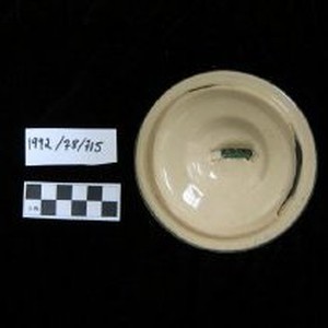 Beige enameled cast iron pot lid with green accent on edges and handle.