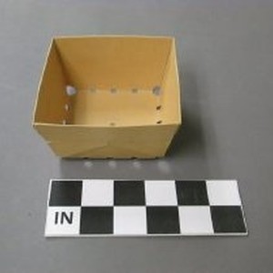 Fruit carton, paper, tan color. Constructed out of one piece of thin cardboard folded to make four side panels and bottom; edges have been glued down. Small holes have been punched along edge and center of bottom.