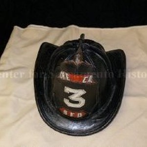 Helmet, Fire - Black leather coated with material to help stiffen and make fire resistent. Metal loop attached to center rear of brim, crown top/front has a golden eagle that holds insignia by its beak, insignia text reads: "CHE[MI]CAL 3 SFD" for the Sacramento Fire Department. Leather, metal, felt, black, red, and white.Metal eagle's head at top front of helmet. Leather plate on front "Che(mi)cal 3 SFD". 23.0 cm x 26.0 cm x 40 cm