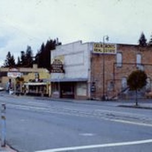 Print, color: The 200 block of South Main Street Sebastopol circa 1970s. The brick building was the location of the Sebastopol Hotel and Royal Theater and in the 1950s the location of the El Rey Theatre. The building is the location of the George N. Groves Real Estate business. Other businesses are Standard Oil gas station, Dutch Boy Paints, Manset Cleaners and the Post Office.