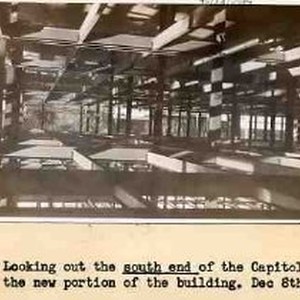 Typed on binder page "Looking out the south end of the CapitolBldg., the new portion of the building. Dec 8th, 1949". Interior view of the iron structure.