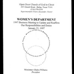 Church of God in Christ Women's Department, agenda, Open Door Church of God in Christ, Dallas, Texas, 1997 January 21. [Description English/roman)]