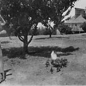 Photo, black and white: The Hallberg fruit drier in the background. Unidentified woman with chickens.