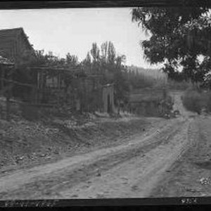 View of unidentified, abandoned rustic wood buildings in a rural setting.