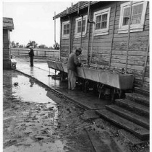 A man washes laundry in an outdoor tub in a barracks camp used by single, transient farmworkers wintering south of Stockton.