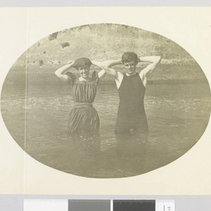 Elizabeth "Bessie" London and Jack London wearing bathing suits stand in water with their hands behind their heads. Title and date transcribed from envelope. Photo is cropped in an oval shape.