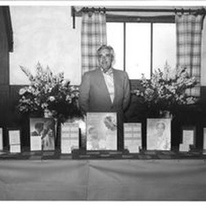 Photo--black and white: George F. Streckfus with an Art Point exhibit at the American Legion Hall April 19, 1952. Streckfus was part owner with his father-in-law Charles R. Myers of Art Point in Sebastopol. "Kay Dee" Reynolds Studio & Camera Shop 119 Bodega Avenue, Sebastopol.