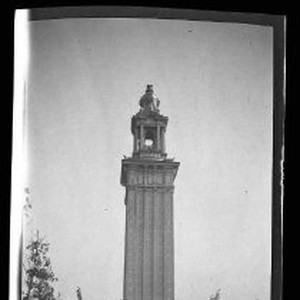 SERIES: Eight views of White City Amusement Park in Chicago, Illinois about 1905. White City was part of the Columbian Exposition of 1893. This view shows the main entrance and bell tower with sculputures lining the street. There is a reflecting pond in front of the tower.